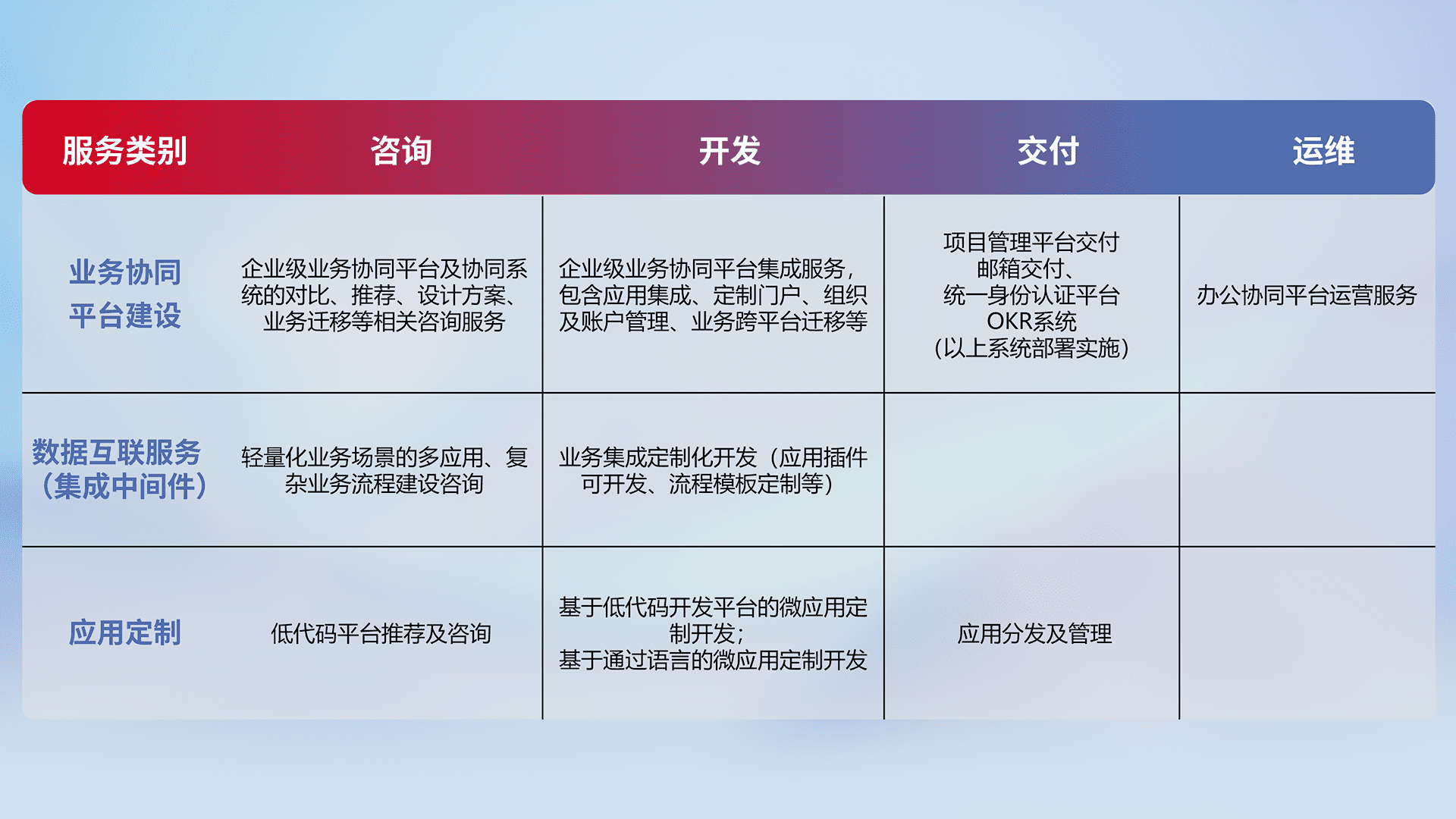 针对钉钉、、企微、、、、IDaas等平台级产品提供产品的规划、、、方案、、交付、、、定制化开发等服务,,,,实现如统一协同办公、、、、智能客户服务、、、混合会议管理、、智能数据查询、、、等业务场景,,,,实现数字化转型。。